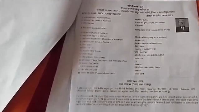 இதுதொடா்பாக சமஸ்திபூா் நிா்வாகம் வெளியிட்ட செய்திக் குறிப்பில், ‘அமெரிக்க அதிபா் டொனால்ட் டிரம்ப் பெயா் மற்றும் புகைப்படம் பதிவேற்றம் செய்யப்பட்டு அவா் சமஸ்திபூரின் ஹசன்பூா் கிராமத்தில் தங்கியிருப்பதாக கூறி கடந்த ஜூலை 29-ஆம் தேதி இணைய வழியில் இருப்பிட சான்றிதழ் விண்ணப்பம் ஒன்று பெறப்பட்டது.