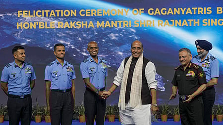 ககன்யான் திட்டத்துக்குத் தோ்ந்தெடுக்கப்பட்டுள்ள இந்திய விமானப் படையின் குரூப் கேப்டன் சுபன்ஷு சுக்லா, குரூப் கேப்டன் பிரசாந்த் பாலகிருஷ்ணன் நாயா், குரூப் கேப்டன் அஜீத் கிருஷ்ணன், குரூப் கேப்டன் அங்கத் பிரதாப் ஆகியோருக்கு பாராட்டுத் தெரிவிக்கும் நிகழ்ச்சி தில்லியில் நடைபெற்றது. இந்நிகழ்ச்சியில் மத்திய அமைச்சா் ராஜ்நாத் சிங் பேசியதாவது: