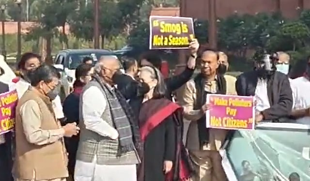 தில்லி காற்று மாசுபாட்டை தடுக்க நடவடிக்கை எடுக்கக் கோரி நாடாளுமன்ற வளாகத்தில் எதிர்க்கட்சி எம்பிக்கள் முகக்கவசம் அணிந்து ஆர்ப்பாட்டம் நடத்தினர்.