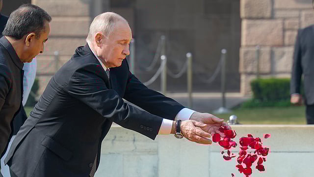 தில்லியில் உள்ள மகாத்மா காந்தி நினைவிடத்தில் ரஷிய அதிபர் விளாதிமீர் புதின் வெள்ளிக்கிழமை மரியாதை செலுத்தினார்.