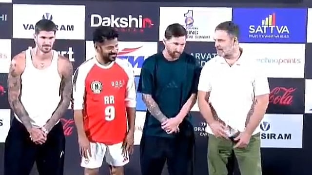 ராகுல் காந்தி வருவதற்கு முன்பு, மெஸ்ஸியுடன் முதல்வர் ரேவந்த் ரெட்டி ராஜீவ் காந்தி சர்வதேச (ஆர்ஜிஐ) கிரிக்கெட் விளையாட்டுத் திடலில் சில நிமிடங்கள் செலவிட்டார்.
