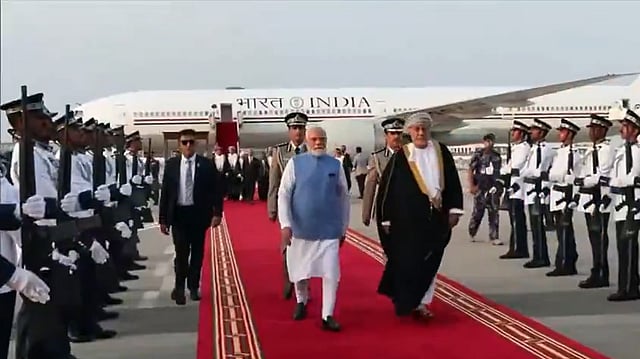ஓமன் தலைநகர் மஸ்கட்டுக்கு விமானத்தில் சென்று இறங்கிய பிரதமர் மோடிக்கு சிவப்புக் கம்பள வரவேற்பளிக்கப்பட்டது. ஓமன் மன்னர் சுல்தான் ஹைதம் பின் தாரிக்குடன் பிரதமர் மோடி கலந்துரையாடுகிறார்.