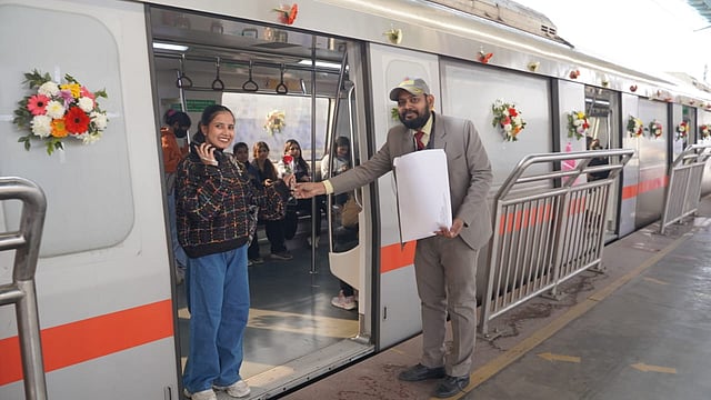 தில்லி மெட்ரோ தொடங்கப்பட்ட நாளை நினைவுக்கூறும் வகையில் மலா்களால் அலங்கரிக்கப்பட்ட டிஎஸ்-01 ரயில் அதன் முதல் வழித்தடத்தில் வியாழக்கிழமை இயக்கப்பட்டது. இந்த ரயிலில் பயணித்த பயணிகளை தில்லி மெட்ரோ நிலைய பணியாளா்கள் மலா்கள் கொடுத்து வரவேற்றனா்.