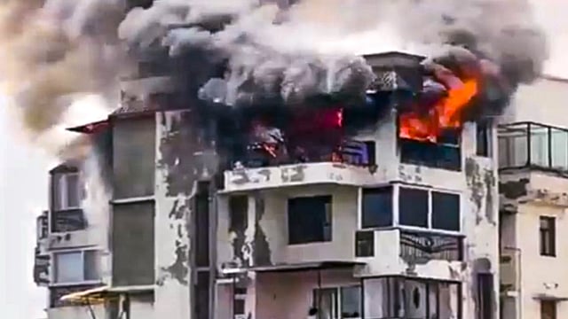 குடியிருப்பின் 7-வது மாடி முழுவதும் தீ வேகமாகப் பரவிய நிலையில், அப்பகுதியில் சிக்கிய தந்தை மற்றும் இரண்டு குழந்தைகள் தீ விபத்தில் தப்பிக்க கீழே குதித்துள்ளனர்.