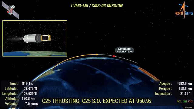 இஸ்ரோவால் 4,410 கிலோ எடையிலான சிஎம்எஸ்- 03 செயற்கைக்கோள் எல்விஎம்-3 ராக்கெட் மூலம் ஞாயிற்றுக்கிழமை மாலை விண்ணில் செலுத்தப்பட்டு வெற்றிகரமாக நிலைநிறுத்தப்பட்டுள்ளது. இதைத் தொடர்ந்து, இஸ்ரோ விஞ்ஞானிகளுக்கு பாராட்டு குவிகிறது.