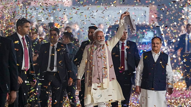 இந்த நிலையில், தில்லியில் உள்ள பாஜக தலைமைச் செயலகத்தில் நடைபெற்று வரும் கொண்டாட்ட நிகழ்ச்சியில் பிரதமர் நரேந்திர மோடி, உள்துறை அமைச்சர் அமித் ஷா, பாதுகாப்புத் துறை அமைச்சர் ராஜ்நாத் சிங் மற்றும் பாஜக தேசியத் தலைவர் ஜெ.பி. நட்டா ஆகியோர் கலந்துகொண்டனர்.