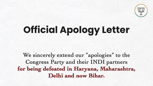பாஜகவின் மன்னிப்புக் கடிதத்தில், ``ஹரியாணா, மகாராஷ்டிரம், தில்லி மற்றும் இப்போது பிகாரில் தோற்கடிக்கப்பட்டதற்காக காங்கிரஸ் கட்சிக்கும், அவர்களின் இந்தியா கூட்டணிக்கும் எங்கள் மன்னிப்பை மனதாரத் தெரிவித்துக் கொள்கிறோம்.
