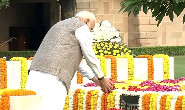 தில்லியில் உள்ள மகாத்மா காந்தி நினைவிடத்தில் பிரதமர் நரேந்திர மோடி வியாழக்கிழமை மரியாதை செலுத்தினார்.