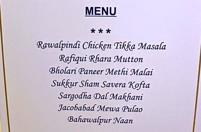 ராவல்பிண்டி சிக்கன் டிக்கா, பஹவல்பூர் நான், பாலாகோட் திரமிசு போன்றவை, பஞ்சாப் மாநிலம் ஆதம்பூர் விமானப் படைத் தளத்தில் அக். 8ஆம் தேதி நடைபெற்ற விமானப் படை நாள் விழாவில், அளிக்கப்பட்ட மெனுக்களின் பெயர்கள்.