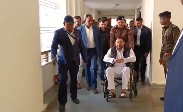 பிகார் சட்டப்பேரவை கூட்டத்துக்கு சக்கர நாற்காலியில் எதிர்க்கட்சித் தலைவர் தேஜஸ்வி யாதவ் வருகைதந்துள்ளார்.