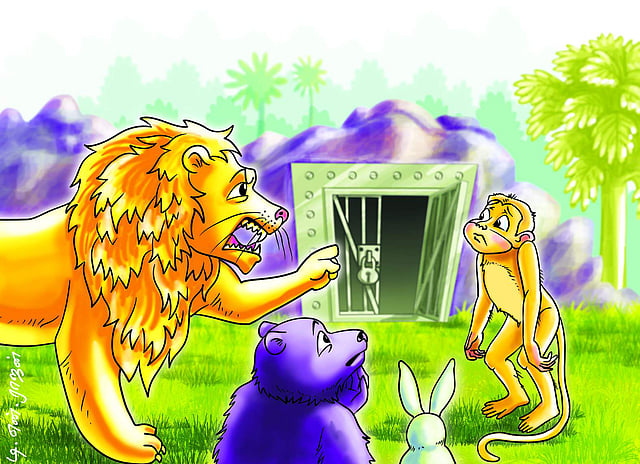 வெகு நாள்களாகியும் குணமாகாத அந்தக் காலோடு சிங்க ராஜா குகையை விட்டு வெளியே வந்தது. அப்போது, ஓரிடத்தில் திறந்து வைக்கப்பட்டிருந்த ஒரு கூண்டுக்குள், ஆட்டுக்குட்டி இருப்பதைக் கண்டு ஆவலுடன் அதன் மீது பாய்ந்தது. திடீரென்று கூண்டுக் கதவுகள் மூடுவதைப் பார்த்துத் திகைத்தது. கூண்டுக்குள் அகப்பட்டுக் கொண்டோமே என்று ஆத்திரத்தில் கர்ஜித்தது.