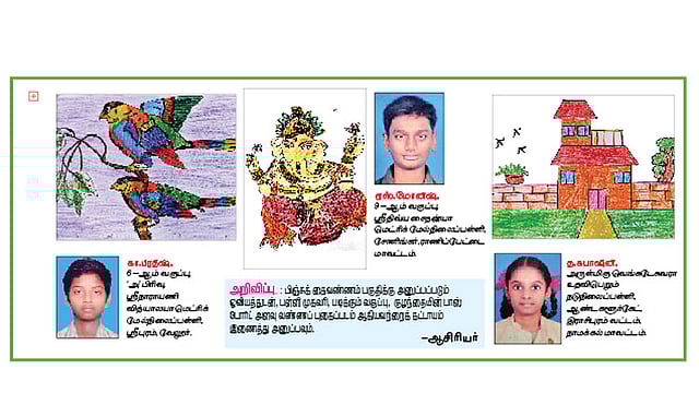 பிஞ்சுக் கைவண்ணம் பகுதிக்கு அனுப்பப்படும் ஓவியத்துடன், பள்ளி முகவரி, படிக்கும் வகுப்பு, குழந்தையின் பாஸ் போர்ட் அளவு வண்ணப் புகைப்படம் ஆகியவற்றைக் கட்டாயம் இணைத்து அனுப்பவும்.