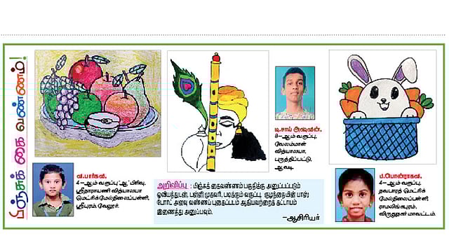 பிஞ்சுக் கைவண்ணம் பகுதிக்கு அனுப்பப்படும் ஓவியத்துடன், பள்ளி முகவரி, படிக்கும் வகுப்பு, குழந்தையின் பாஸ் போர்ட் அளவு வண்ணப் புகைப்படம் ஆகியவற்றைக் கட்டாயம் இணைத்து அனுப்பவும்.