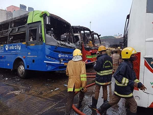 சென்னை கோயம்பேட்டில் நிறுத்தப்பட்டிருந்த 5 ஆம்னி பேருந்துகள் தீயில் எரிந்து சேதமடைந்தன.