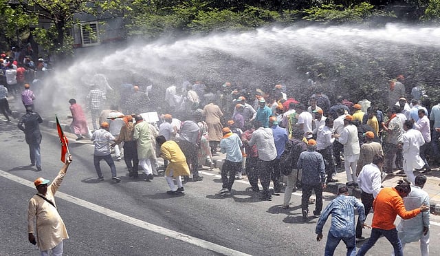 தில்லி கலால் கொள்கை விவகாரத்தில் முதல்வா் அரவிந்த் கேஜரிவால் பதவி விலக கோரி, பாஜகவினா் சட்டப் பேரவை அருகே திங்கள்கிழமை போராட்டத்தில் ஈடுபட்டனா்.