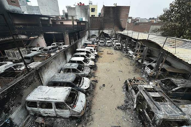 குடியுரிமைத் திருத்தச் சட்டம் தொடர்பாக வடகிழக்கு தில்லியில் நடந்த வன்முறையில் சிவபுரி பகுதியில் எரிக்கப்பட்ட கார்கள்.