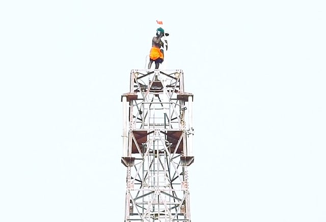 தகவல் அறிந்து நிகழ்விடத்துக்கு விரைந்து வந்த தீயணைப்பு மற்றும் மீட்புப் படையினா், போலீசார் ஆரப்பனுடன் பேச்சுவாா்த்தை நடத்தி கோபுரத்திலிருந்து அவரைப் பாதுகாப்பாக கீழே இறங்க வைப்பதற்கான முயற்சியில் தொடர்ந்து ஈடுபட்டு வருகின்றனர்.