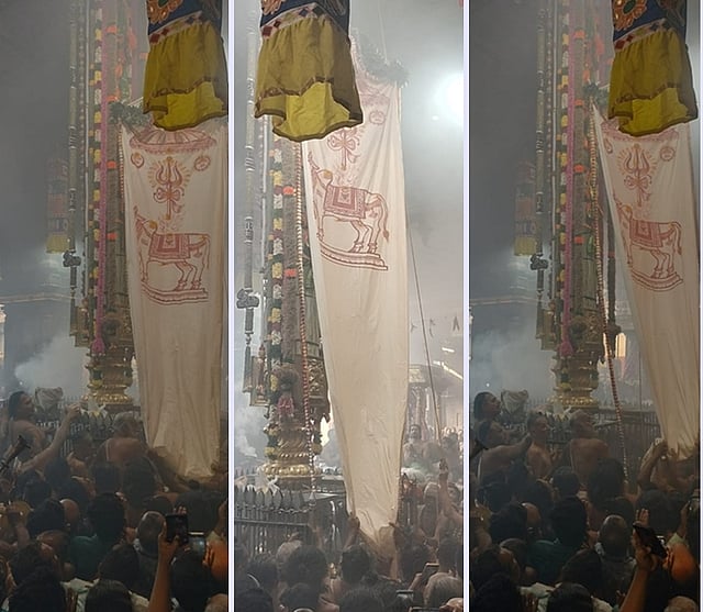 அதன்படி, நிகழாண்டு மாா்கழி ஆருத்ரா தரிசன உற்சவம் சிவகாமசுந்தரி சமேத நடராஜமூர்த்தி வீற்றுள்ள சித்சபை எதிரே உள்ள கொடிமரத்தில், பஞ்சமூர்த்திகள் முன்னிலையில், சுவாமியின் பிரதிநிதியான ஹஸ்தராஜரை முன்னிறுத்தி ஆவாஹணம் செய்து வியாழக்கிழமை காலை 8 மணிக்கு உற்சவ ஆச்சாரியார் கே.சிவாநாத் தீட்சிதர் ரிஷபக் கொடியை ஏற்றி வைத்தார்.