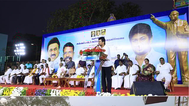 ஆதம்பாக்கத்தில் அண்ணல் அம்பேத்கர் சிலை திறப்பு விழா நிகழ்ச்சியில் பேசும் துணை முதல்வர் உதயநிதி ஸ்டாலின்.