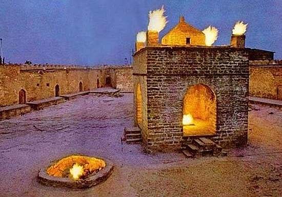 தீயின் அடியில் இவை மிக முக்கியம். ஏனெனில் 3 மதங்களுடன் இந்த தீ சம்பந்தப்பட்டிருக்கிறது. பெர்சியர்களின் காலத்தில் (தற்போதைய ஈரான்) இது அடேஸ்காஹ் என்று அழைக்கப்பட்டிருக்கிறது. அப்படியென்றால் நெருப்பின் இல்லம் என்று பொருள். அதனை அவர்கள் வழிபட்டிருப்பதும் தெரியவருகிறது. இவை நடந்ததெல்லாம் 10-ஆம் நூற்றாண்டில், அதன்பின்னர் மத்திய கிழக்கில் குறிப்பாக ஈரானை மையமாகக் கொண்டு ஜொராஷ்டிரியம் பரவ ஆரம்பித்தது. அவர்களும் இந்த இடத்தை தங்களுடைய சடங்குகளின் முக்கிய ஸ்தலமாகப் போற்றியிருக்கின்றனர். அங்கே ஒரு கோட்டை கட்டப்பட்டு அதன் மையத்தில் தீ எரிவதற்கான தொட்டியும் கட்டப்பட்டுள்ளது.