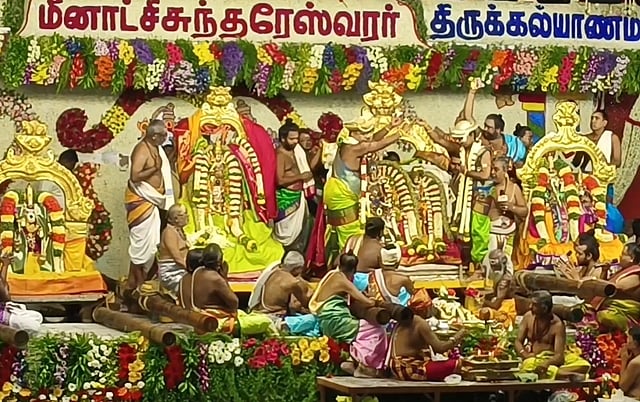 மதுரை சித்திரைத் திருவிழாவின் முக்கிய விழாவான அருள்மிகு மீனாட்சி அம்மன் சுந்தரேசுவரர் திருக்கல்யாண வைபவம் இன்று கோலாகலமாக நடைபெற்றது. விழாவில் பல்லாயிரக்கணக்கான பக்தர்கள் பங்கேற்று சுவாமி தரிசனம் செய்தனர்.