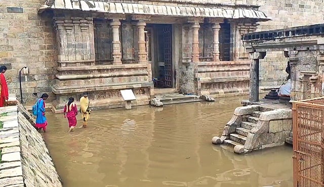 கும்பகோணத்தில் பெய்த மழையினால் உலக புகழ்பெற்ற தாராசுரம் ஐராவதீஸ்வரர் கோயிலில் மழை நீர் சூழ்ந்ததால் சுற்றுலாப் பயணிகளும், பக்தர்களும் அவதியடைந்தனர்.