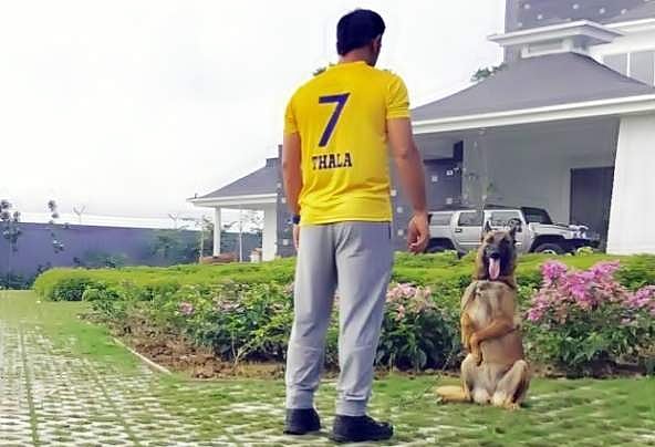 அந்தப் புகைப்படத்தில், 'தல' என்ற பெயருடன் தனது '7'-வது நம்பர் சென்னை சூப்பர் கிங்ஸ் ஜெர்ஸியுடன் தோனி, தனது வீட்டின் வெளியே நிற்கிறார். அவரது செல்ல நாய் எழுந்து நின்று வணக்கம் வைக்கிறது.