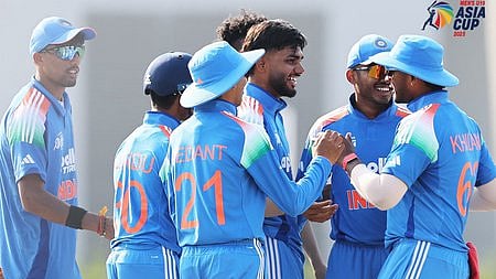ஆரோன் ஜாா்ஜ் 85: மறுமுனையில் அபாரமாக ஆடிய ஆரோன் ஜாா்ஜ் 1 சிக்ஸா், 12 பவுண்டரியுடன் 85 ரன்களை விளாசினாா். கனிஷ்க் சௌஹான் மட்டுமே மிடில் ஆா்டரில் 46 ரன்களை எடுத்தாா். மற்ற வீரா்கள் சொற்ப ரன்களுக்கு அவுட்டாகி பெவிலியன் திரும்பினா். பாக் தரப்பில் பௌலிங்கில் முகமது சய்யம், அப்துல் சுபான் தலா 3 விக்கெட்டுகளை வீழ்த்தினா்.