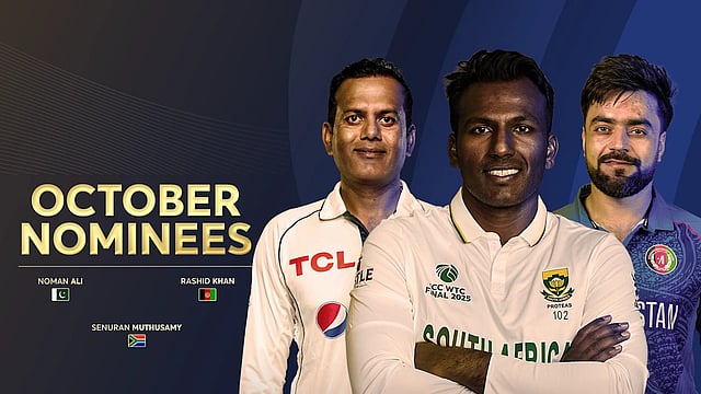 அந்த வகையில் அக்டோபர் மாதத்துக்கான சிறந்த வீரர் விருதுக்கான போட்டியில் பாகிஸ்தானின் நோமன் அலி, ஆப்கானிஸ்தானின் ரஷீத்கான், தென்னாப்பிரிக்காவின் செனுரன் முத்துசாமி உள்ளிட்ட மூன்று சுழற்பந்து வீச்சாளர்கள் தேர்வு செய்யப்பட்டுள்ளனர்.