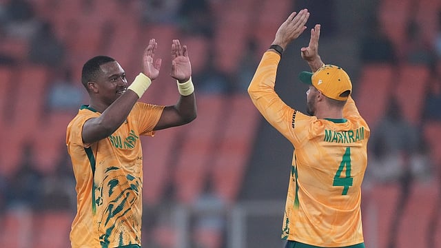 அரை சதம் கடந்த மாா்க்ரம் 10 பவுண்டரிகள், 1 சிக்ஸருடன் 59 ரன்களுக்கு பெவிலியன் திரும்பினாா். ரிக்கெல்டன் 3 பவுண்டரிகள், 1 சிக்ஸா் உள்பட 33 ரன்களுக்கு ஆட்டமிழக்க, 4-ஆவது பேட்டா் டெவால்டு பிரெவிஸ் 6 ரன்களுக்கு வெளியேற்றப்பட்டாா்.