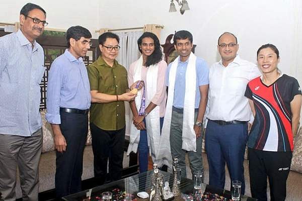 இதையடுத்து மத்திய விளையாட்டுத்துறை அமைச்சர் கிரண் ரிஜிஜுவை மரியாதை நிமித்தமாக செவ்வாய்கிழமை சந்தித்தார் பி.வி.சிந்து. ரூ.10 லட்சத்துக்கான காசோலை வழங்கி அமைச்சர் ரிஜிஜூ பாராட்டினார். அப்போது அவரது பயிற்சியாளரும் பாட்மிண்டன் வீரருமான கோபிசந்த் உடனிருந்தார்.
