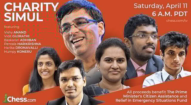விஸ்வநாதன் ஆனந்த், ஹம்பி, அதிபன், விதித் குஜ்ராத்தி, ஹரிகா போன்ற இந்திய செஸ் வீரர்கள், chess.com என்கிற இணையத்தளம் வழியாக ஏப்ரல் 11 அன்று இந்திய நேரம் மாலை 6.30 மணிக்கு வீரர்கள் மற்றும் ரசிகர்களுடன் செஸ் விளையாட்டில் ஈடுபடவுள்ளார்கள். இதன்மூலம் திரட்டப்படும் நிதி, இந்தியப் பிரதமரின் பொது நிவாரண நிதிக்கு வழங்கப்படும். இதில் கலந்துகொள்ள ஆர்வமுள்ள ரசிகர்கள், பதிவுக்கட்டணமாக ரூ. 1902 (25 டாலர்) செலுத்தவேண்டும். இதன்பிறகு முதல் ஆறு இடங்களில் உள்ள இந்திய வீரர்களில் இருவருடன் அவர்கள் விளையாடலாம். விஸ்வநாதன் ஆனந்துக்கு எதிராக விளையாட வேண்டும் என்றால் குறைந்தபட்சம் ரூ. 11,412 (150 டாலர்) வழங்கவேண்டும். இதுதொடர்பான கூடுதல் விவரங்களை, chess.com என்கிற இணையத்தளத்தில் அறியலாம்.