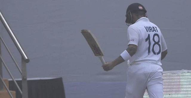 அந்த ஓவரின் கடைசிப் பந்தில் கோலியை எல்பிடபிள்யூ செய்தார் அஜாஸ் படேல். டக் அவுட் ஆன கோலி நடுவரின் முடிவை எதிர்த்து டிஆர்எஸ் முறையீடு செய்தார். பந்து முதலில் பேட்டில் பட்டதா அல்லது கால் காப்பில் (pad) பட்டதா என்பது தெளிவாகத் தெரியாத நிலையில் நடுவரின் முடிவை மாற்ற முடியாது என 3-ம் நடுவர் அறிவித்தார். இதில் அதிர்ச்சியடைந்த கோலி, கள நடுவரிடம் விளக்கம் கேட்டார். பிறகு கோபத்துடன் ஓய்வறைக்குச் சென்றார்.