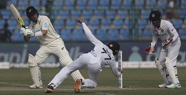 இதன்பிறகு விளையாடிய நியூசிலாந்து அணி இந்திய அணியின் பந்துவீச்சை அபாரமாக எதிர்கொண்டது. டாம் லதம், வில் யங் ஆகிய இருவரும் அஸ்வின், ஜடேஜா, அக்ஷர் படேலின் சுழற்பந்து வீச்சை நன்கு விளையாடியதால் விக்கெட் எடுக்க முடியாமல் திணறியது இந்திய அணி.