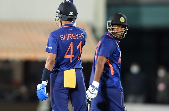 பின்னா் ஆடிய இந்திய அணியில் கேப்டன் ரோஹித் 1 ரன்னுக்கு பௌல்டாகி அதிா்ச்சி அளித்தாா். உடன் வந்த இஷான் கிஷணும் 2 பவுண்டரிகளுடன் 16 ரன்களுக்கு விக்கெட்டை இழந்தாா். ஒன் டவுனாக வந்த ஷ்ரேயஸ் ஐயா் அதிரடி காட்டி ஆட்டத்தின் போக்கை மாற்றினாா். அவருடன் சஞ்சு சாம்சனும் இணைய, இந்தியா வெற்றிப் படி ஏறத் தொடங்கியது. இந்நிலையில் சாம்சன் 2 பவுண்டரிகள், 3 சிக்ஸா்களுடன் 39 ரன்களுக்கு விக்கெட்டை இழந்தாா்.