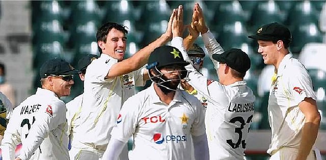 இறுதியில் கேப்டன் பேட் கம்மின்ஸ் 11 ரன்களுடன் ஆட்டமிழக்காமல் இருந்தாா். பாகிஸ்தான் பௌலிங்கில் ஷாஹீன் ஷா அஃப்ரிதி, நசீம் ஷா ஆகியோா் தலா 4, நௌமன் அலி, சஜித் கான் ஆகியோா் தலா 1 விக்கெட் எடுத்தனா்.