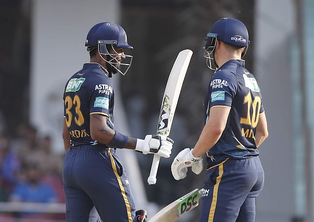 இந்தப் போட்டியில் டாஸ் வென்ற குஜராத் டைட்டன்ஸ் பேட்டிங்கைத் தேர்வு செய்தது. இதனையடுத்து, அந்த அணியின் தொடக்க ஆட்டக்காரர்களாக விருத்திமான் சாஹா மற்றும் சுப்மன் கில் களமிறங்கினர். குஜராத் அணிக்கு தொடக்கமே அதிர்ச்சியாக அமைந்தது. சுப்மன் கில் 0 ரன்னில் ஆட்டமிழந்து அதிர்ச்சியளித்தார். அதன்பின் களமிறங்கியவர்கள் அனைவரும் சொற்ப ரன்களில் ஆட்டமிழக்க அந்த அணியிம் கேப்டன் ஹார்திக் பாண்டியா மற்றும் விருத்திமான் சாஹா நிதான ஆட்டத்தை வெளிப்படுத்தினர். இதனால் அணியின் ரன் ஓரளவுக்கு உயர்ந்தது. நிதானமாக விளையாடிய சாஹா 47 ரன்களில் ஆட்டமிழந்து வெளியேறினார். அதில் 6 பவுண்டரிகள் அடங்கும். கடைசி கட்டத்தில் கேப்டன் ஹார்திக் பாண்டியா சிறிது அதிரடி காட்ட அந்த அணியின் ரன்கள் சற்று உயர்ந்தது. அவர் 50 பந்துகளில் 66 ரன்கள் குவித்தார். அதில் 2 பவுண்டரிகள் மற்றும் 4 சிக்ஸர்கள் அடங்கும்.