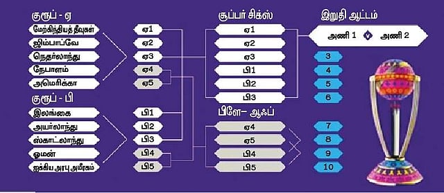 குரூப் சுற்று: அந்த தகுதிச்சுற்றில் பங்கேற்கும் அணிகள், ஆட்டங்கள் குறித்த அட்டவணையை ஐசிசி செவ்வாய்க்கிழமை வெளியிட்டது. அதில் பங்கேற்கும் 10 அணிகளும் குரூப் ‘ஏ’, ‘பி’ என இரண்டாக பிரிக்கப்பட்டுள்ளன. இதில் ஒவ்வொரு அணியும் தங்கள் பிரிவில் இருக்கும் இதர அணிகளுடன் மோதும்.