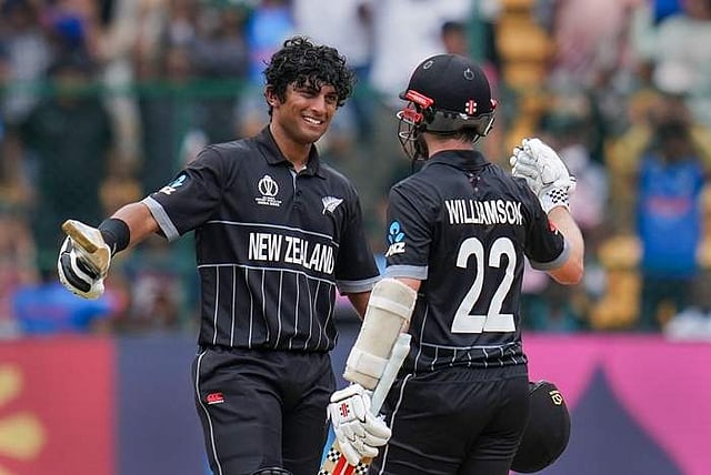 தொடக்க வீரர் கான்வே 35 ரன்களில் ஆட்டமிழக்க அடுத்து வந்த வில்லியம்சனும் ரச்சினும் சிறப்பாக விளையாடினார்கள். அசத்தலாக விளையாடிய ரச்சின் ரவீந்திரா சதமடித்து 108 ரன்களுக்கு ஆட்டமிழந்தார்.