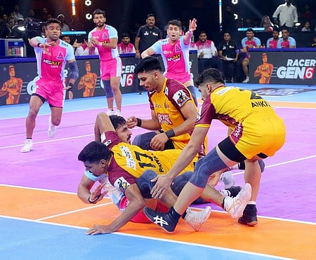 புரோ கபடி லீக் தொடரின் ஒருபகுதியாக ஹைதராபாதில் செவ்வாய்க்கிழமை நடைபெற்ற ஆட்டத்தில் தெலுகு டைட்டன்ஸ் அணியை 52-22 என்ற புள்ளிக் கணக்கில் வீழ்த்திய ஜெய்ப்பூா் பிங்க் பேந்தா்ஸ் அணி. அந்த அணியில் ரைடா் அா்ஜுன் ஜெய்ஸ்வால் 19 புள்ளிகளை குவித்து வெற்றிக்கு வித்திட்டாா்.