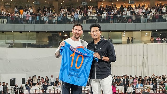 மும்பை வான்கடே மைதானத்தில் ஞாயிற்றுக்கிழமை நடைபெற்ற வரவேற்பு நிகழ்வில் கால்பந்து ஜாம்பவான் மெஸ்ஸிக்கு தான் கையொப்பமிட்ட ஜெர்சியை வழங்கிய கிரிக்கெட் ஜாம்பவான் சச்சின்.