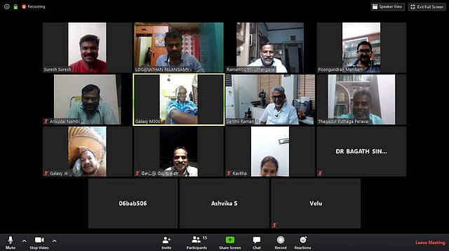 இதைத்தான் நாங்கள் பயன்படுத்துகிறோம். புதன்கிழமை வரை 11 மெய்நிகர் கூட்டங்கள் நடைபெற்றுள்ளன. 'வெர்சுவல் மீட்டிங்' என்பதை 'மெய்நிகர்' கூட்டம் எனத் தமிழ்ப்படுத்தியிருக்கிறோம். தினமும் இரவு 7 மணிக்கு எங்கள் கூட்டங்கள் தொடங்குகின்றன.