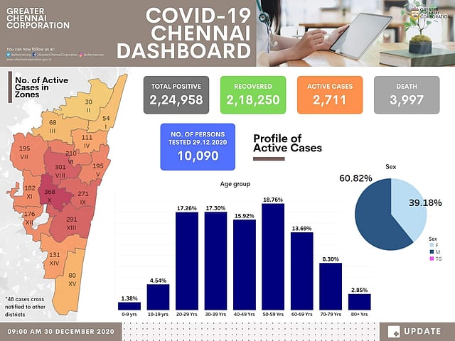 சென்னையில் ஒட்டுமொத்தமாக கரோனா பாதித்தவர்களின் எண்ணிக்கை 2,24,958 ஆக உள்ளது. இவர்களில் 2,18,250 பேர் குணமடைந்துள்ளனர். தற்போது சென்னையில் கரோனா பாதித்தவர்களில் 2,711 பேர் சிகிச்சை பெற்று வருகிறார்கள்.