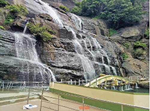 குற்றாலம் பேரருவியில் பரவலாக விழும் தண்ணீர்.