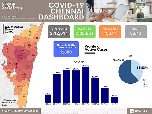 சென்னையில் ஒட்டுமொத்தமாக கரோனா பாதித்தவர்களின் எண்ணிக்கை 2,12,014 ஆக உள்ளது. கரோனா பாதித்தவர்களில் இதுவரை 2,03,824 பேர் குணமடைந்துள்ளனர். கரோனா பாதித்தவர்களில் 3,816 பேர் பலியாகிவிட்டனர். ஒட்டுமொத்த பாதிப்பில் இது 1.80 சதவீதமாகும்.