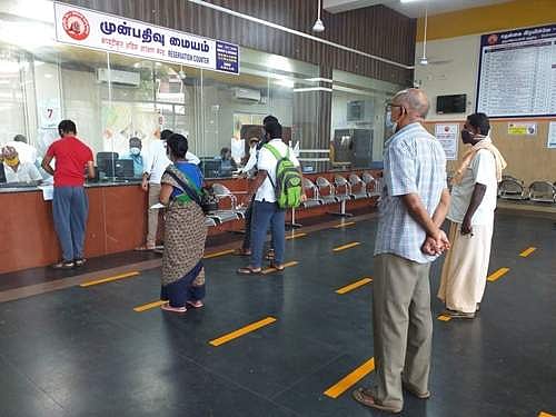 பயணச்சீட்டு பெற வரும் பயணிகள் சமூக இடைவெளியுடன் நிற்பதற்கான ஏற்பாடுகளும் செய்யப்பட்டுள்ளன.