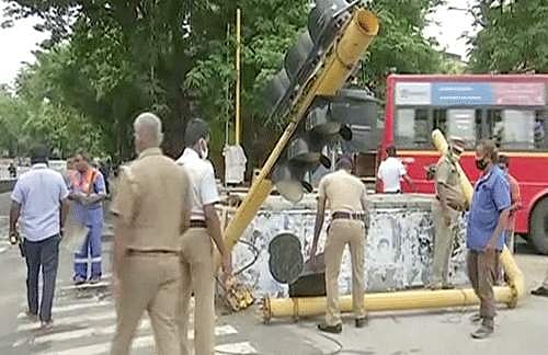 விபத்து ஏற்படுத்திய லாரியை கைப்பற்றிய போக்குவரத்து காவலர்கள் தப்பிச் சென்ற ஓட்டுநரைத் தேடி வருகின்றனர்.