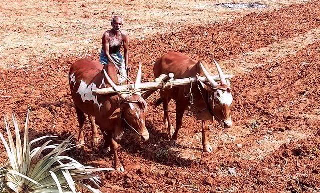 வாழப்பாடி அடுத்த உமையாள்புரத்தில் காளைகளை பூட்டி ஏர் உழும் விவசாயி வீராசாமி.