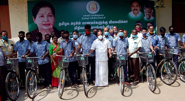 திருப்பூர் தெற்கு தொகுதி சட்டப்பேரவைத் தொகுதிக்குட்பட்ட 4 பள்ளிகளில் படிக்கும் 2,161 மாணவ, மாணவிகளுக்கு விலையில்லா மிதிவண்டிகளை அத்தொகுதி சட்டப்பேரவை உறுப்பினர் சு.குணசேகரன் சனிக்கிழமை வழங்கினார்.
