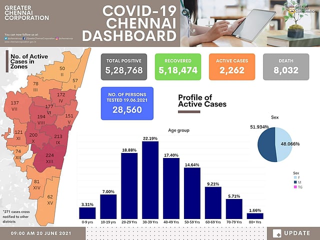 சென்னை மாநகராட்சி இன்று வெளியிட்டுள்ள கரோனா பாதிப்பு நிலவரப்படி சென்னையில் மொத்த கரோனா பாதிப்பு 5,28,768 ஆக அதிகரித்துள்ளது. இதுவரை கரோனாவுக்கு 8,032 பேர் உயிரிழந்துள்ளனர். பாதிக்கப்பட்டோரில் 5,18,474 பேர் குணமடைந்துள்ளனர்.